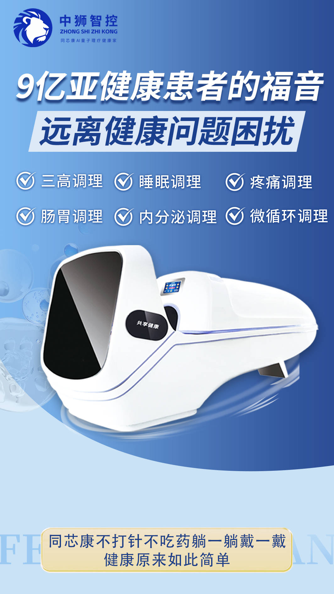 当全民健康意识觉醒,“未病先防” 成为消费刚需,慢病调理市场迎来了万亿级蓝海。中狮智控重磅推出的同芯康 AI 量子理疗健康家项目,凭借独特的技术优势、创新的运营模式和完善的扶持体系,成为量子理疗慢病快调的开创者,为健康产业注入全新活力,也为创业者提供了难得的财富机遇。