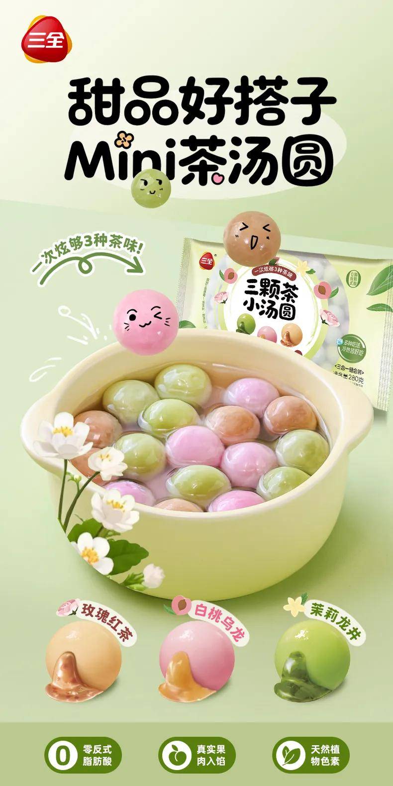三颗茶小汤圆主打 “三味合一”,含茉莉龙井、白桃乌龙、玫瑰红茶风味,天然植物粉赋予多彩颜值,“mini 小颗” 适配一口体验,贴合年轻人对便捷甜品的偏好。