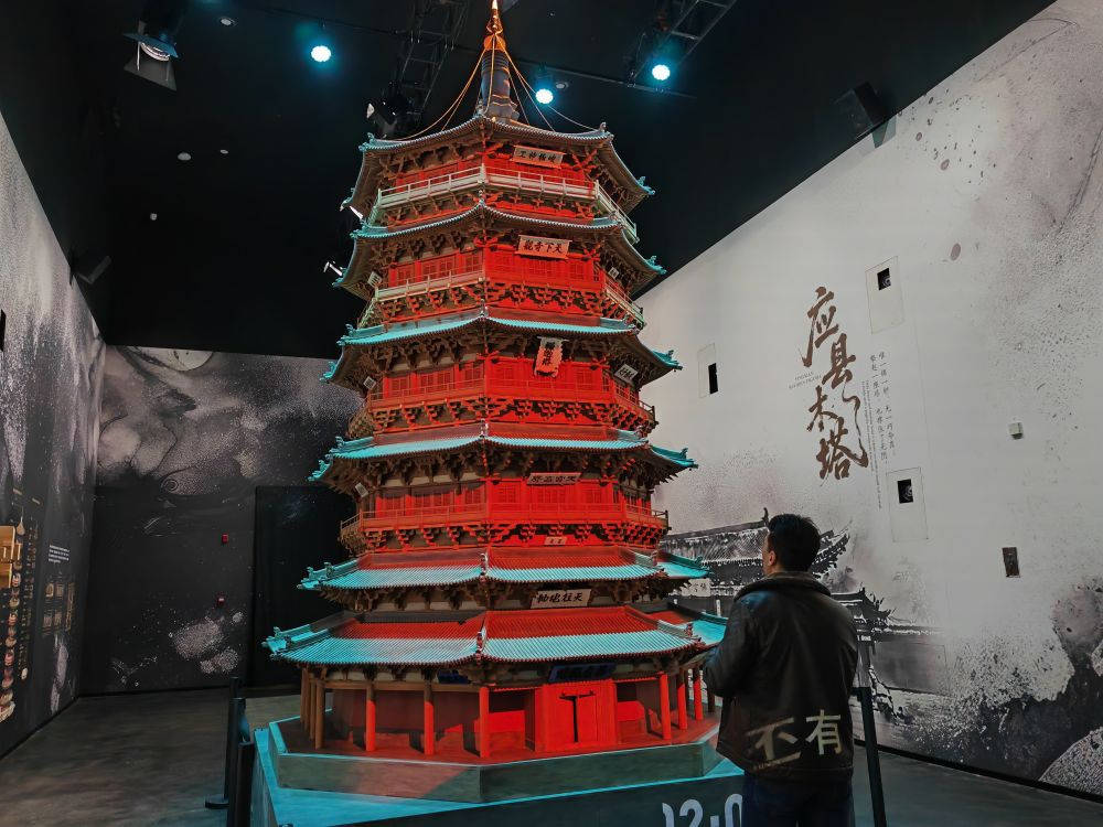 1月14日,在山西省太原市举办的“《黑神话:悟空》遇见山西——古建数字艺术展”上,一名埃及留学生在参观应县木塔模型。